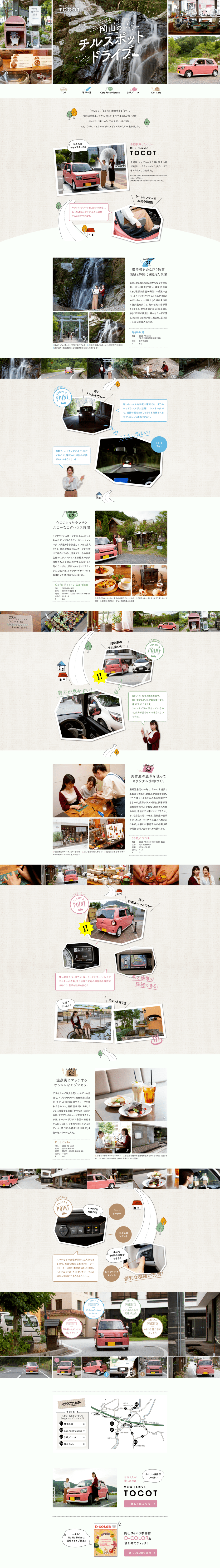 2018年に岡山ダイハツ様より発売された「ミラトコット」。発売と同時に公開をした紹介LPサイトに引き続き、岡山の読者モデルを起用して実車に試乗していただきながら観光スポットを巡る特別企画「岡山のチルスポットドライブ」の制作を担当させていただきました。 今回はデザインやコーディング以外にも、訪問先店舗のリストアップ、取材交渉、現地取材、撮影、モデル手配までを担当。タイトルに冠した“チルスポット”のとおり、取材先はゆったりと癒されるスポットを選定しました。準備に相応の期間がかかりましたが、株式会社ワードらしい雑誌の編集要素をふんだんに盛り込んだ制作物になりました。