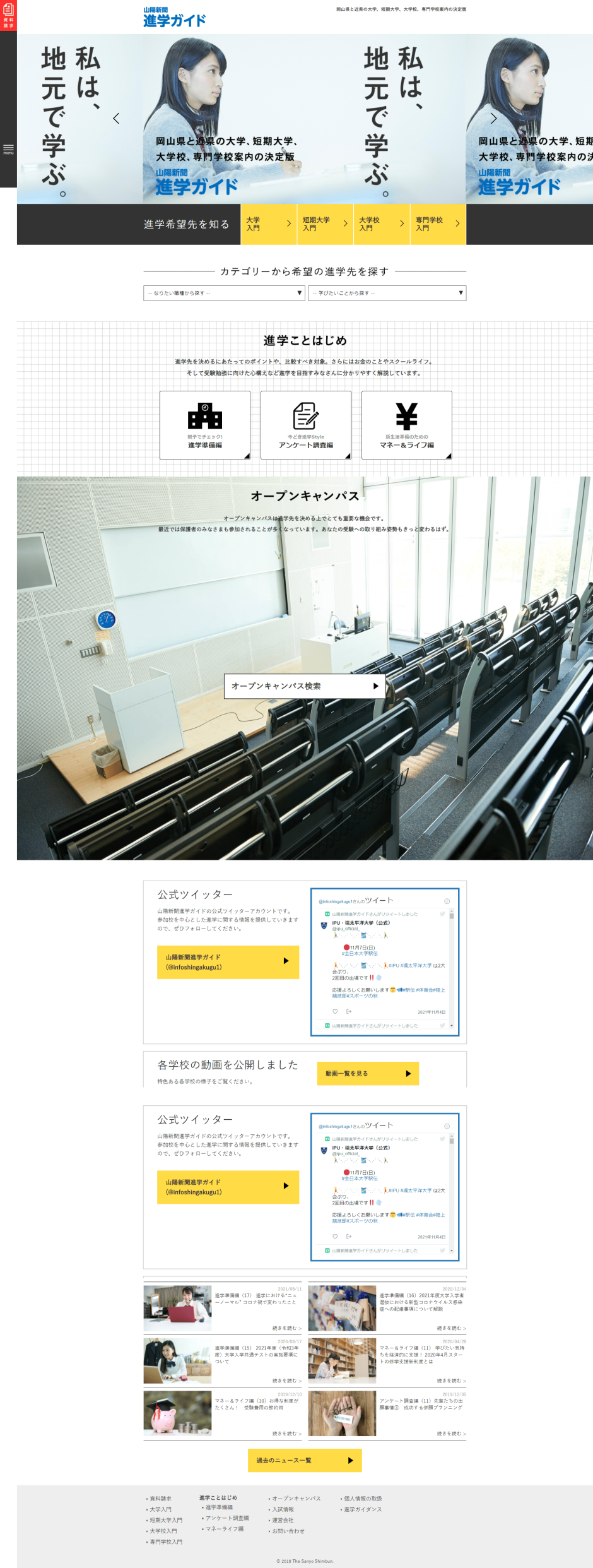 山陽新聞社様が運営する、岡山に進学を希望する高校生と保護者に向けたWEBサイト。株式会社ワードはWEBサイトのデザインや構築ではなく、企画や学校への取材、記事執筆、進学コラムの作成、CMS入力作業、一部コーディングなどを担当しました。