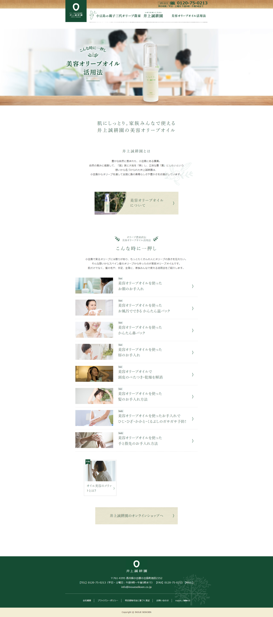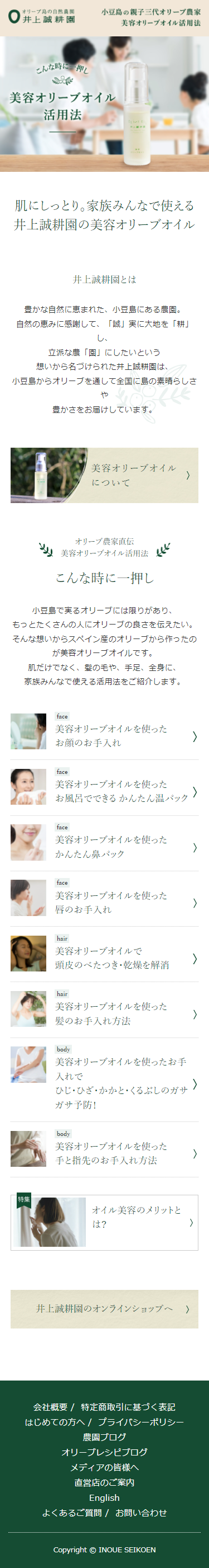 株式会社ワードが手がけるコンテンツマーケティングの第二弾。今回は美容オリーブオイルの活用法を紹介するWEBサイトの制作に、広告代理店様のサポートとして入らせていただきました。オリーブオイル製品を製造・販売する井上誠耕園様は、提供する製品ラインアップの質の良さから、岡山県・香川県はもちろん、全国規模で高い人気を誇る企業です。執筆には岡山県を拠点に活躍する美容専門家の協力も仰ぎながら一編一編、丁寧に取材し、書き上げました。今後も継続して有益な情報をWEBサイト上にアップしていく予定です。
