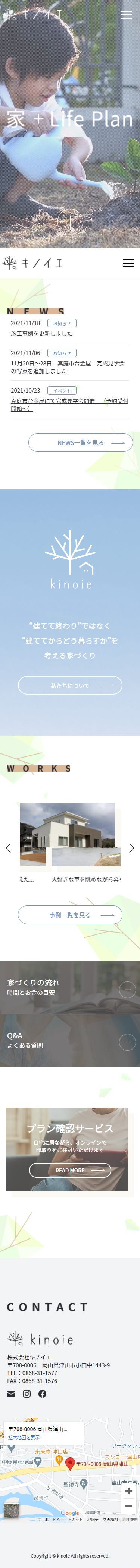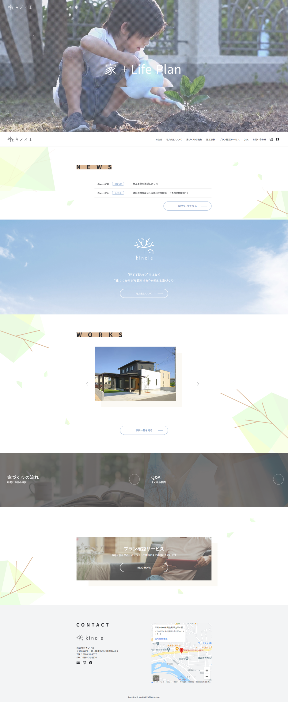2020年5月、岡山県津山市に誕生した住宅工務店「キノイエ」様。ファイナンシャルプランナーの資格を有する建築士が、それぞれの家族のライフプランに合った理想の暮らしを叶える家を実現します。 今回は広告代理店様のサポートとして、ロゴデザインから名刺、封筒、そしてホームページまで幅広いツールの制作に携わらせていただきました。新規創業ということで、制作に入る前に細かくヒアリングを実施。大切にされている考え方や思いを伺い、制作物に反映させました。