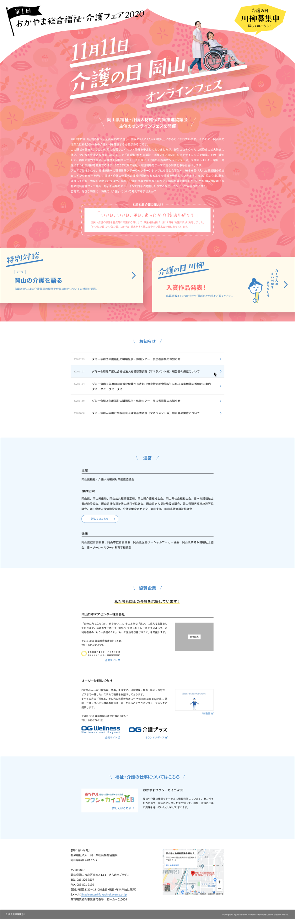 すべての岡山県民が安心して生活できる社会を目指し、地域福祉を総合的に推進している岡山県社会福祉協議会様。高齢化が進展するなか、福祉・介護ニーズに対応できる人材を増やすため、2020年7月に福祉・介護職への理解を深めるイベントの開催を予定されていました。しかし、新型コロナウイルス感染症の拡大にともないやむなく中止に。そこで会場ではなくオンライン上でイベントを開催することになり、広告代理店様を通じて特設ホームページ「11月11日介護の日 岡山オンラインフェス」の制作をご依頼いただきました。