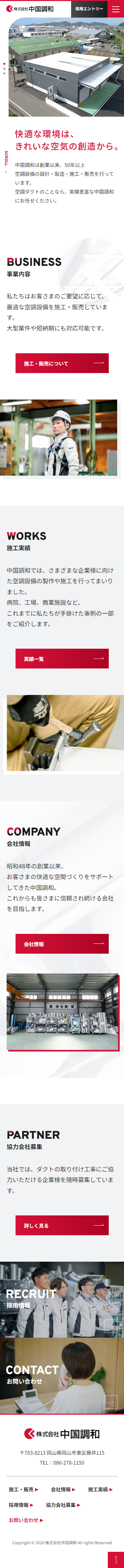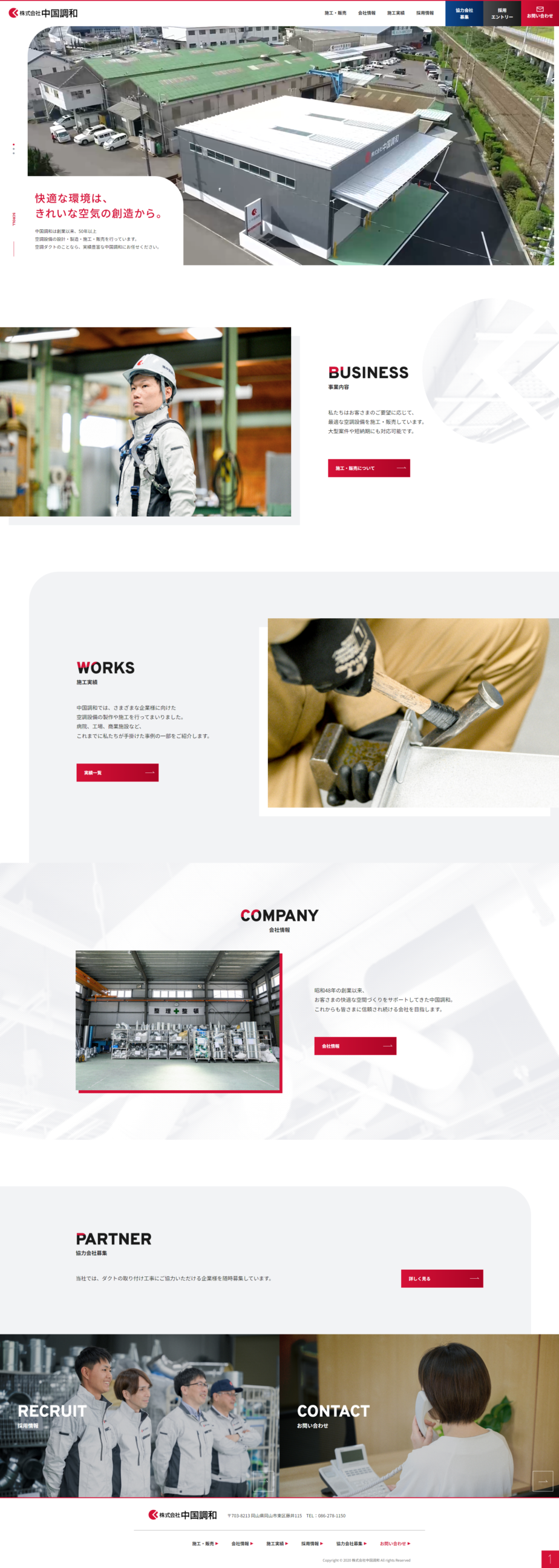 約50年に渡り、岡山県内外の病院や工場、商業施設、学校など、さまざまな場所へ最適な空調ダクト設備を設計、施工してきた中国調和様。以前、ホームページを制作させていただきましたが、より清潔感や安心感のあるデザインにしたいというご希望があり、リニューアルのご相談をいただきました。
