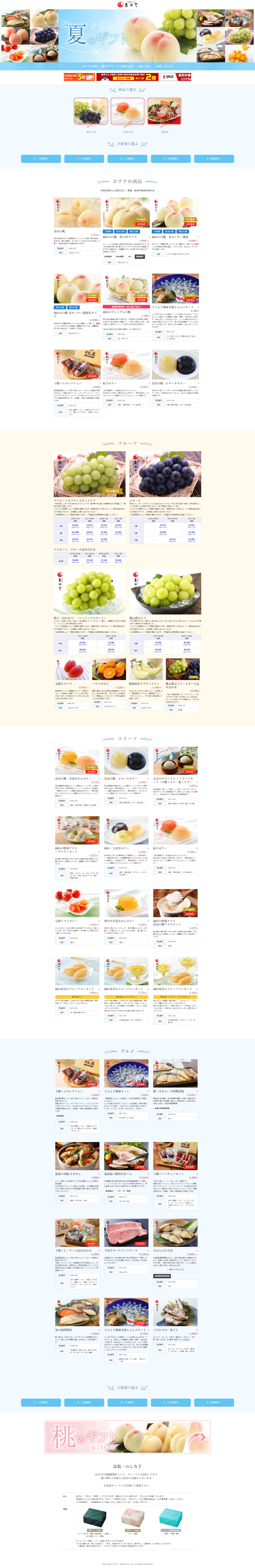 2018年「桃の特集」LPと並行して進めた案件がこちらの「夏のギフト特集」LP。夏のギフトを中心に紹介するWEBサイトのため、岡山の清流を連想させる爽やかなブルーを基調とし、トップスライドには波紋をモチーフとしたデザインを配置しています。