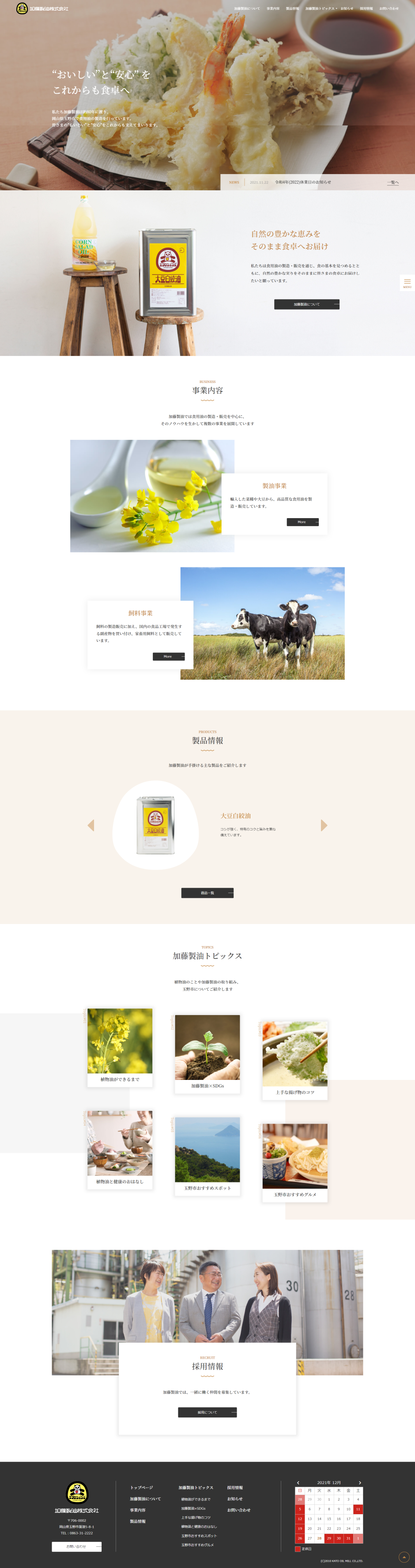 岡山県玉野市で80年に渡り、食用油の製造を行う「加藤製油株式会社」様。もともと使われていたホームページが古く、使い勝手が悪くなっていたことから、リニューアルのご相談をいただきました。さまざまな課題や希望をヒアリングさせていただいた中でも、特に採用に関するページを強化させたいとの思いを強くお持ちでした。