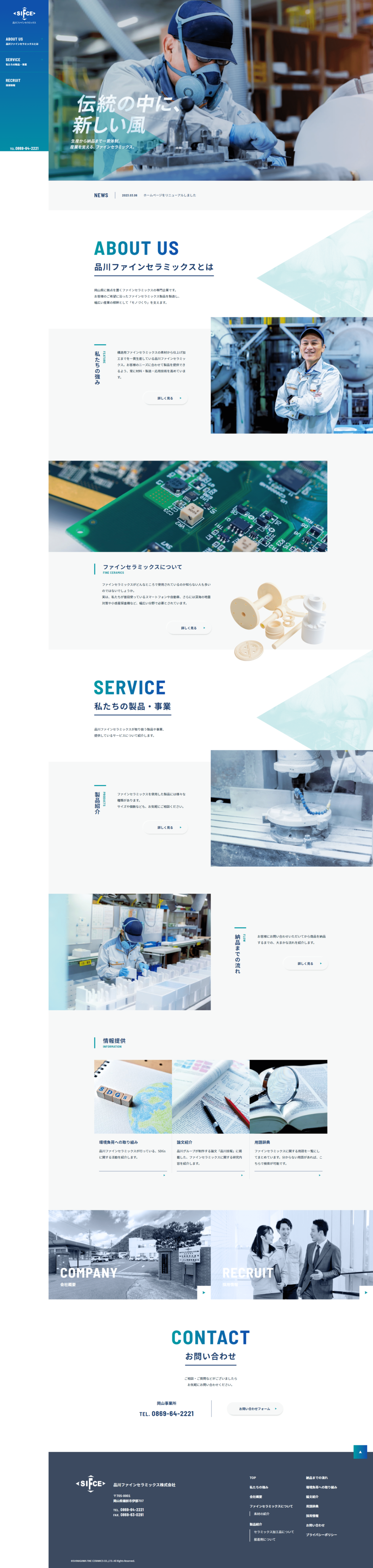 岡山県備前市を拠点に、半導体製造装置や車のエンジン部品など、さまざまな分野で使用されるファインセラミックス製品を製造する「品川ファインセラミックス株式会社」様。もともと使われていたホームページが古くなっていたことから、リニューアルのご相談をいただきました。サイトへのご希望や課題点をヒアリングさせていただいたところ、「社内の業務内容や雰囲気が分かりやすいサイトにしたい」「採用に関するページを充実させたい」といった思いをお持ちでした。