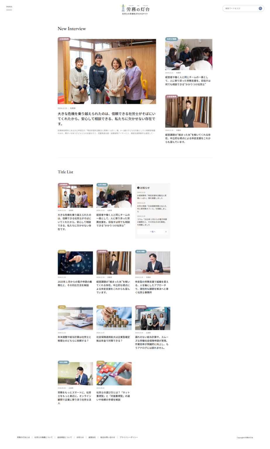 広島県福山市にある「ハタラクデザイン合同会社」様が運営される、社労士マッチングメディサイト「労務の灯台」。日本各地で活躍する社労士の「強み」や「想い」を紹介し、企業が自社の価値観に合った社労士を見つけられるようサポートしています。今回は、このメディアサイトの立ち上げから担当させていただきました。